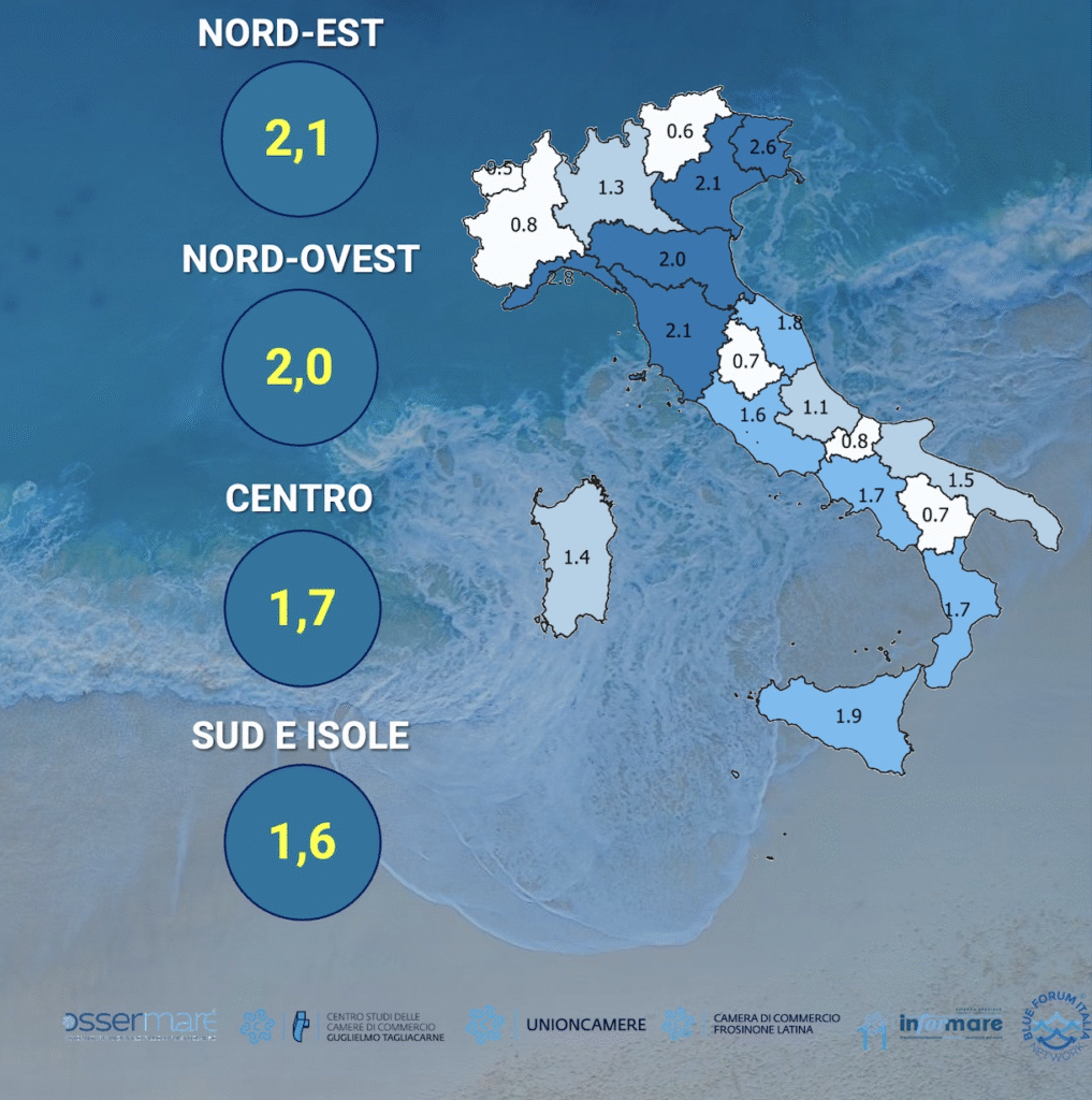 La conformazione geografica del nostro Paese è tale da consentire al sistema economico della Blue Economy di sprigionare tutto il proprio potenziale nel territorio nazionale. Lo stimolo alla crescita è determinato, in primo luogo, dalle imprese localizzate vicino alle coste, che costituiscono la principale componente del tessuto imprenditoriale dell’economia del mare, ma coinvolge anche le aree interne.